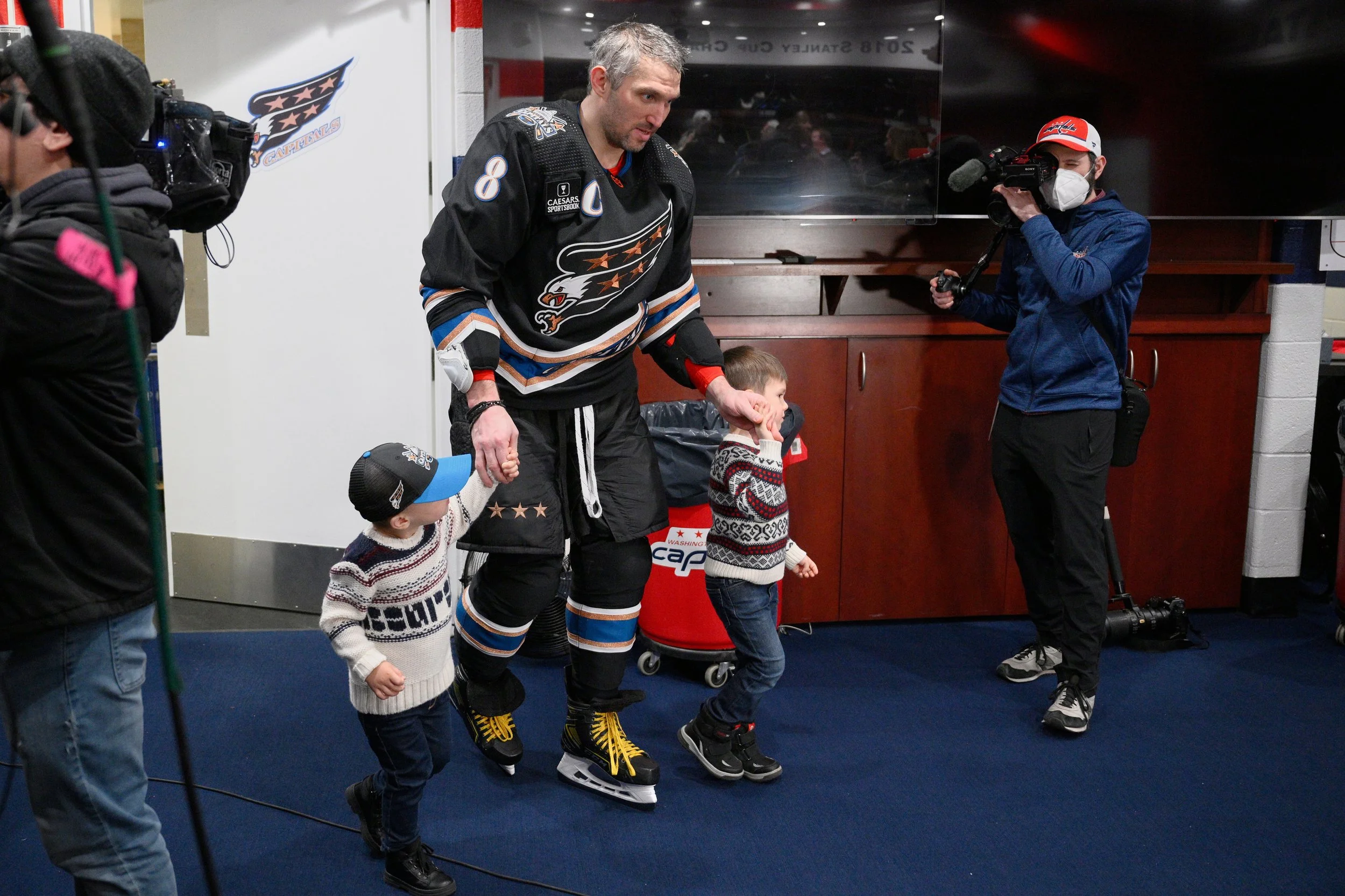 When Ovechkin scored his 801st and 802nd goals just before Christmas 2022, to pass Gordie Howe for second on the all-time list, he walked into the locker room hand-in-hand with Sergei and Ilya and put them on his lap to take photos.